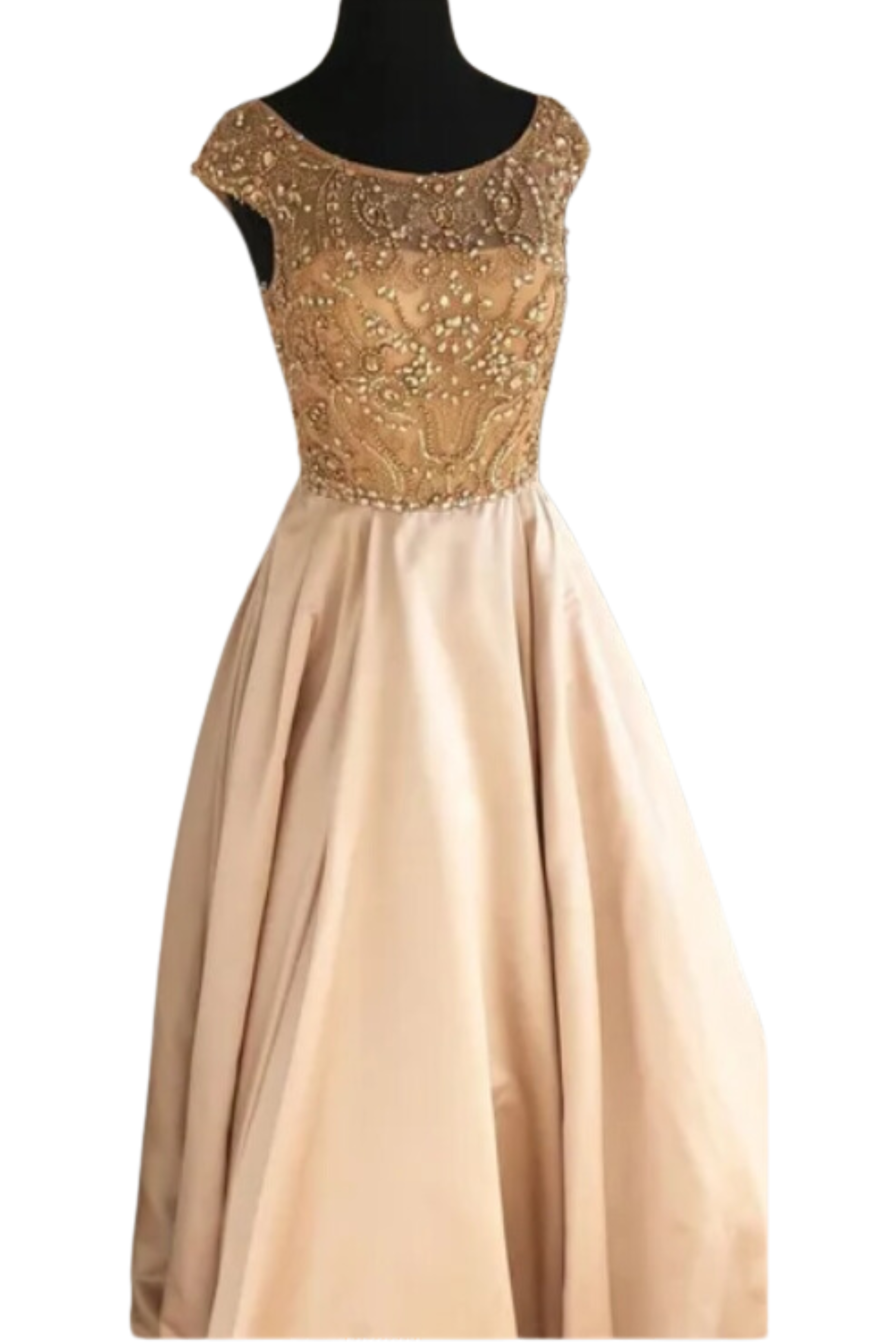This beautiful Sherri Hill Champaign Gown features delicate beading up top and a full satin skirt on the bottom. The condition is pre-owned and there are slight dust/dirt marks on the bottom from being worn once but is wearable without needing to be cleaned. Beading is intact. Original price for this gown is $750. If you'd like additional photos, please contact us at info@dressingfestive.com.